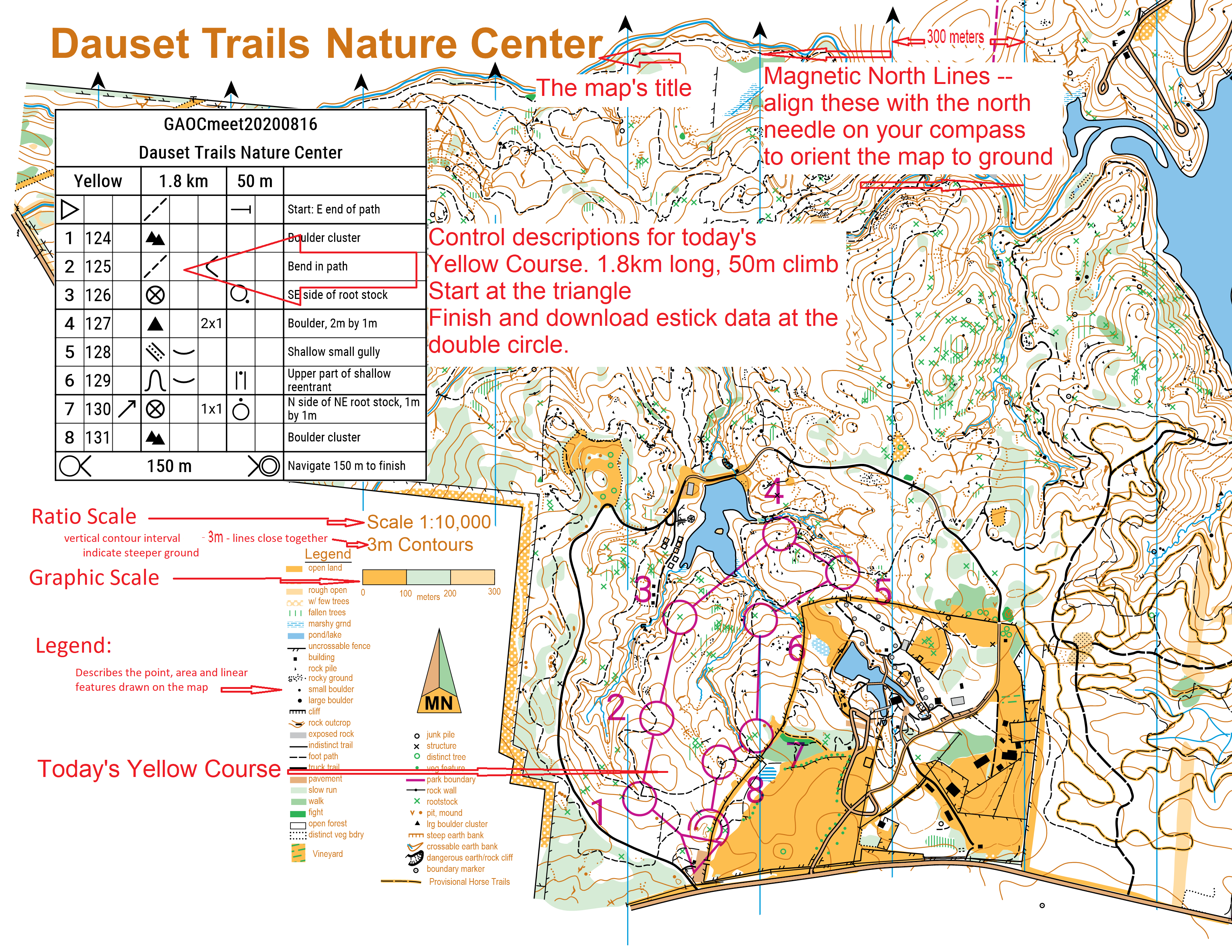 NEW ORIENTEERS = WHITE - 2.0km, Controls are located on trails/streams/fence lines or any other distinct linear feature on the ground. YELLOW - 3.0km, Controls are located within 100 meters of linear features and on distinct point features (boulders, rootstocks etc). The CHALLENGE is to RELOCATE your position on the map by orienting the map to the ground (north) and identifying features on the map as you pass by. The Basic Skills of Orienteering These courses are less than 3 km.