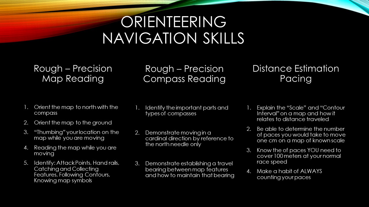 Courses are designed to challenge your navigation abilities. Below are the typically available course colors (White to Blue) and the navigation challenges salient to each course. ORIENTEERING MAP READING BASICS
